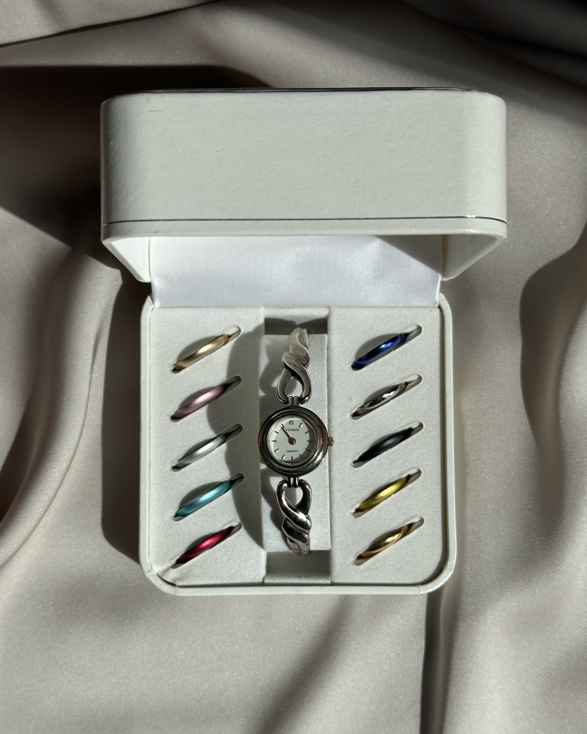 The round, petite dial keeps things timeless and minimal, allowing each bezel to transform the watch’s mood—whether you’re dressing for work, a night out, or just adding a pop of color to your everyday style. It’s essentially a 10-in-1 watch.
