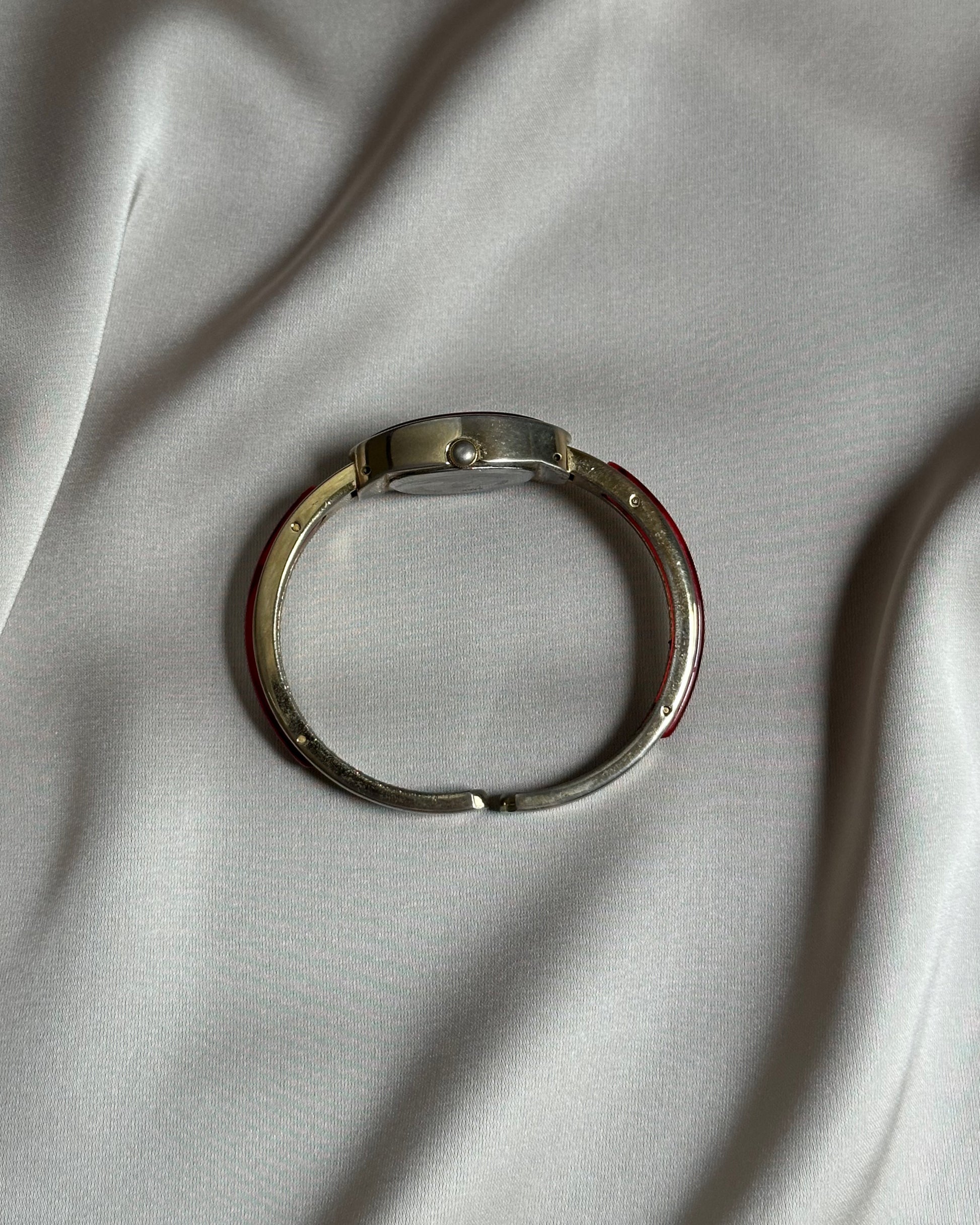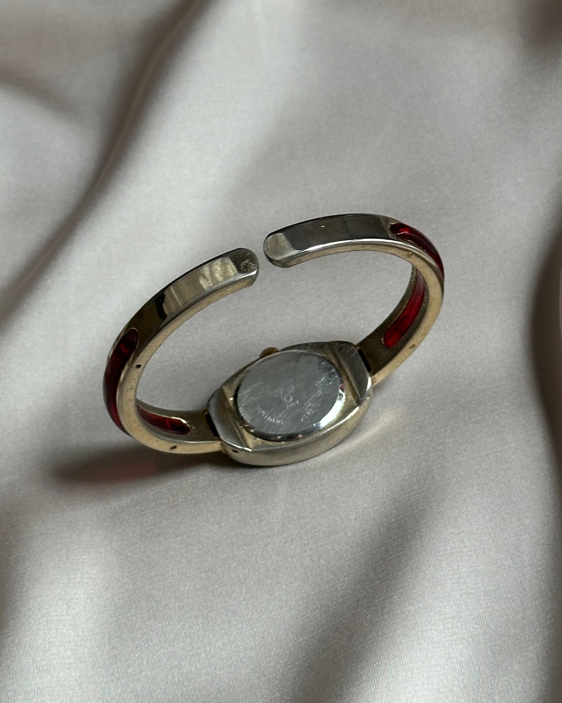 A true statement from the 90s, this timepiece blends playful boldness with feminine glamour. Featuring a juicy cherry-red resin inlay set into a light gold-tone oval case, the watch doubles as a wrist ornament—equal parts timekeeper and vintage jewel.