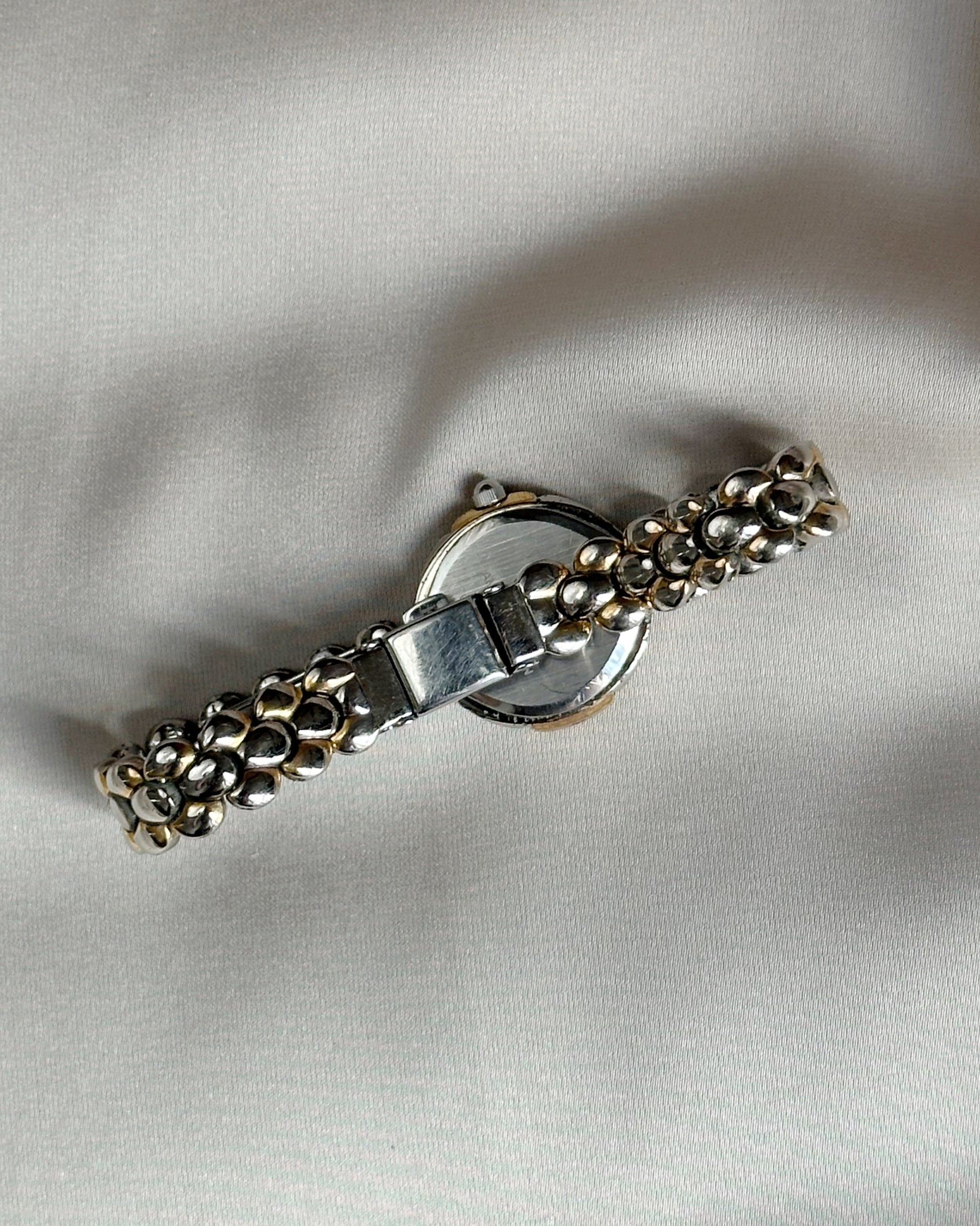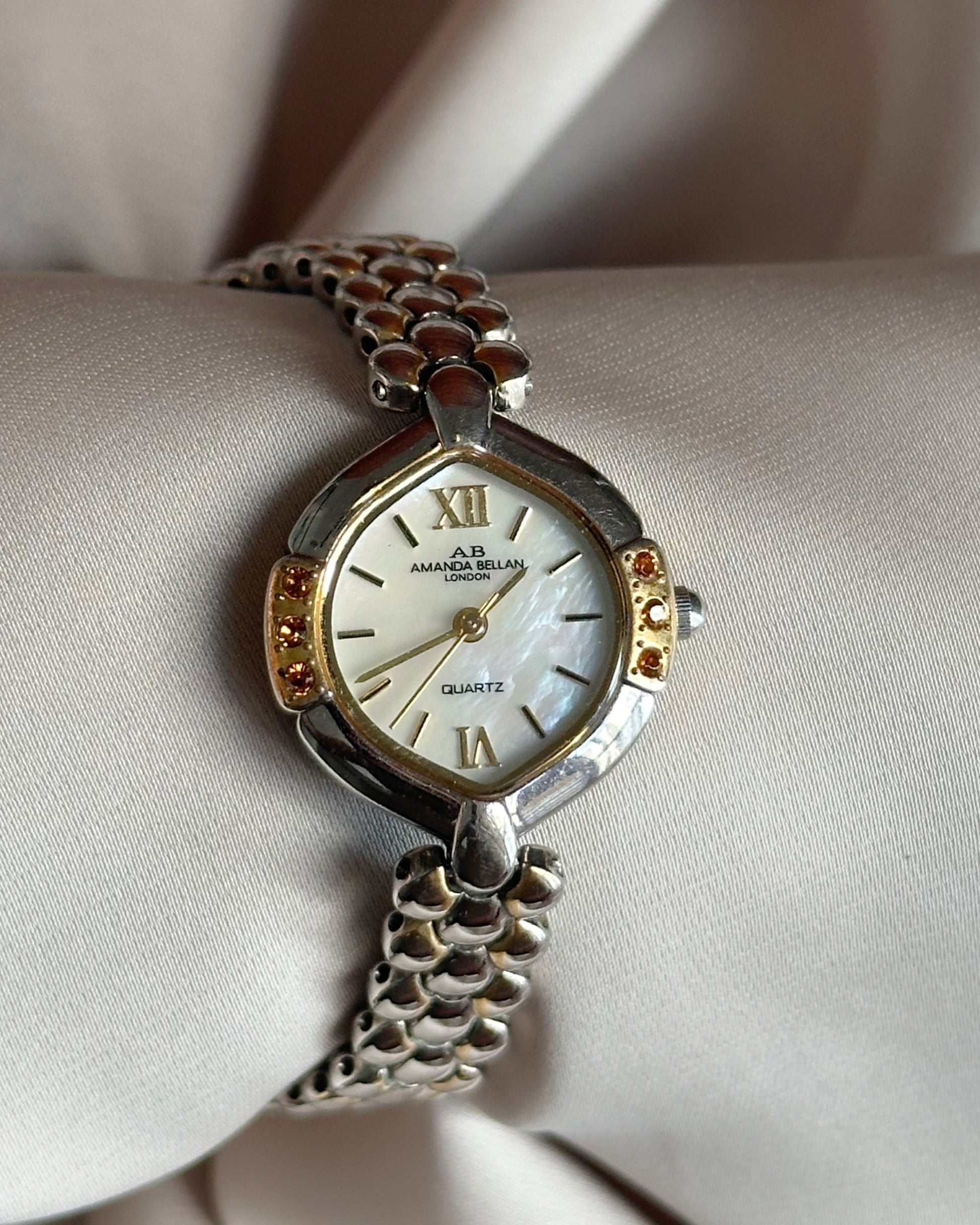 Chic and quietly confident, this Amanda Bellan watch offers an elegant blend of everyday wearability and polished vintage charm. Its petite case is gently curved, flanked by twin golden accents adorned with tiny topaz-like crystals that catch the light just so.