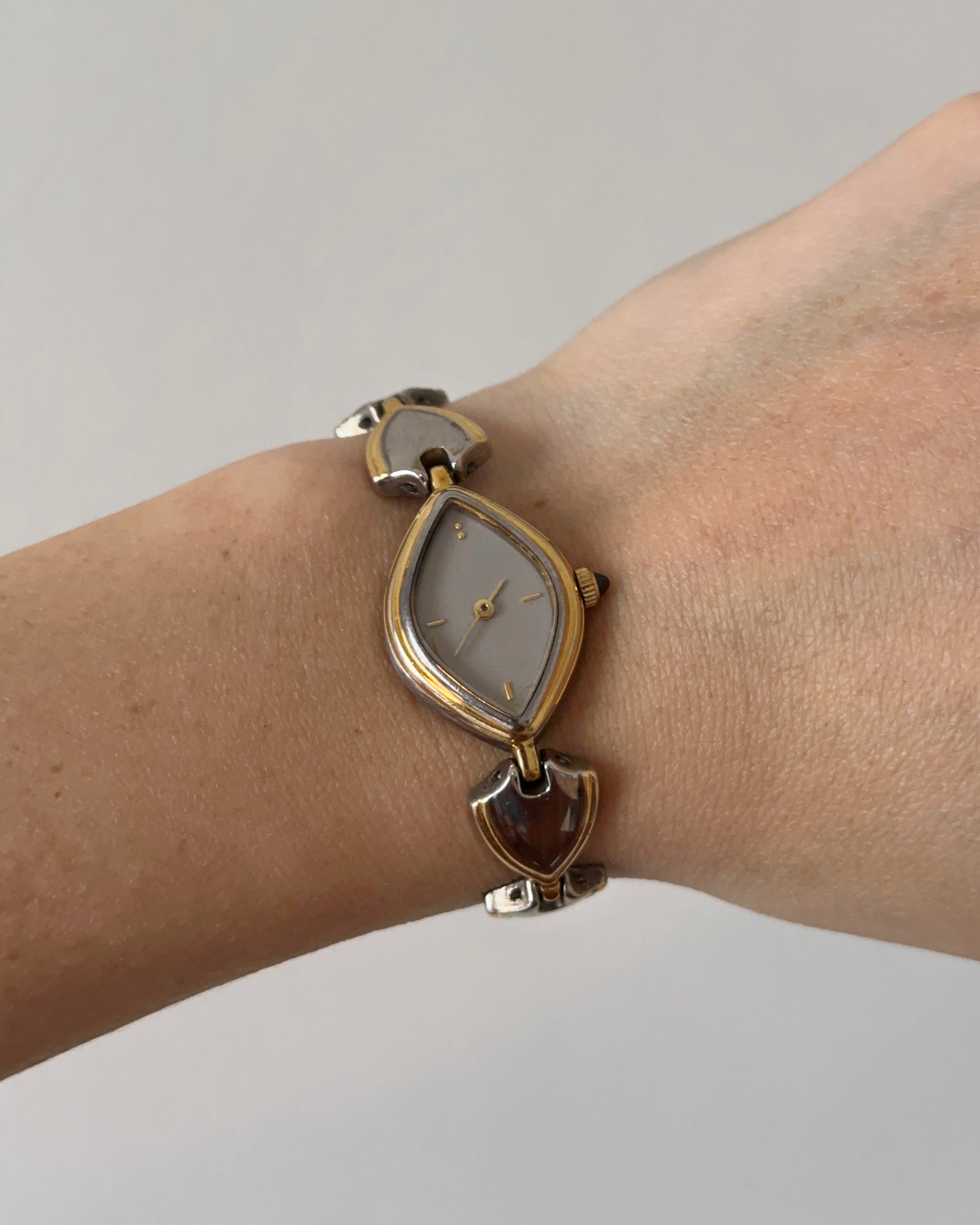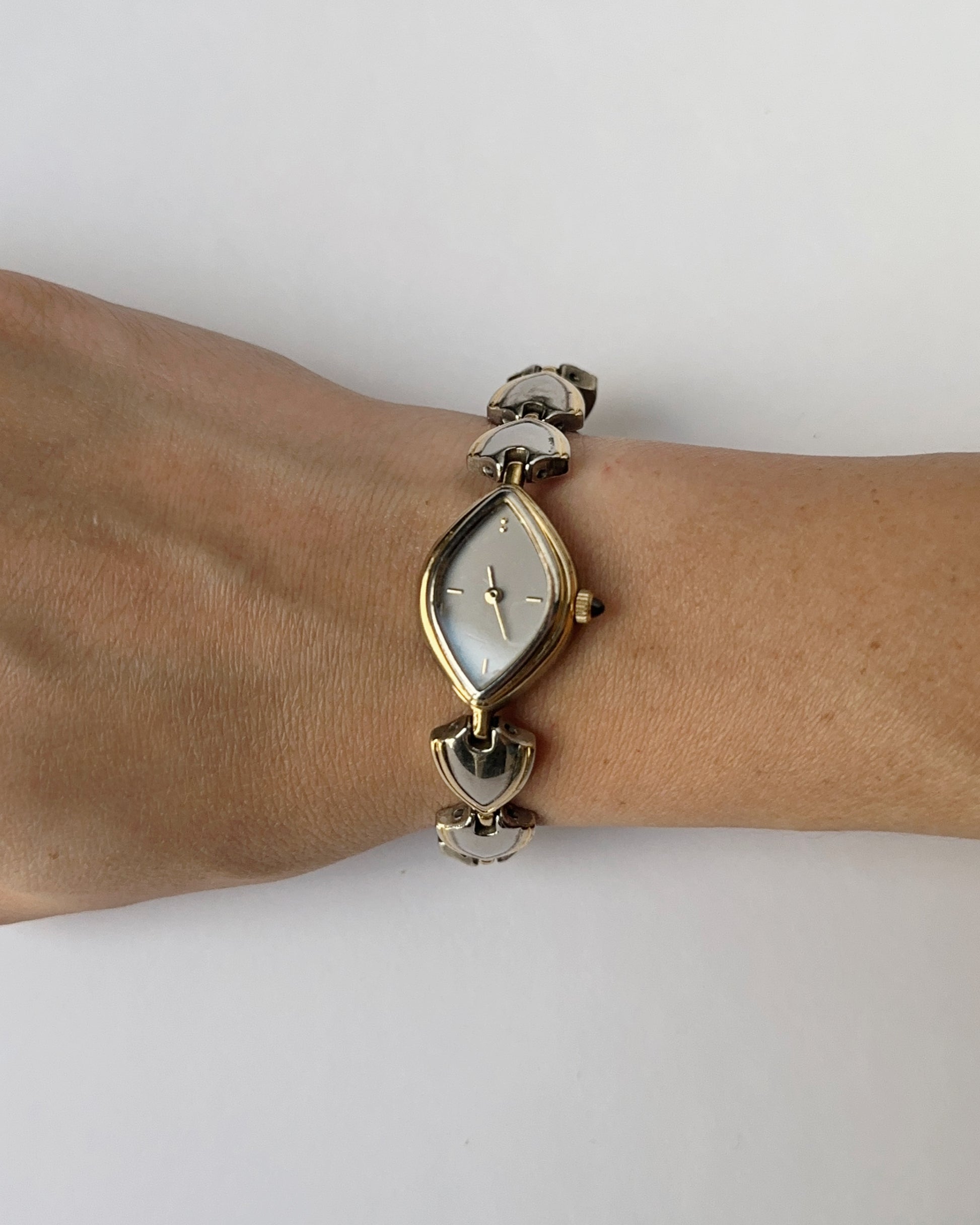With its petal-shaped links and marquise-style dial, this vintage beauty is all about elegant curves and sleek symmetry. The two-tone bracelet — silver with gold-edged accents — wraps the wrist like a chain of sculpted leaves, creating a piece that’s as much art as it is timepiece.