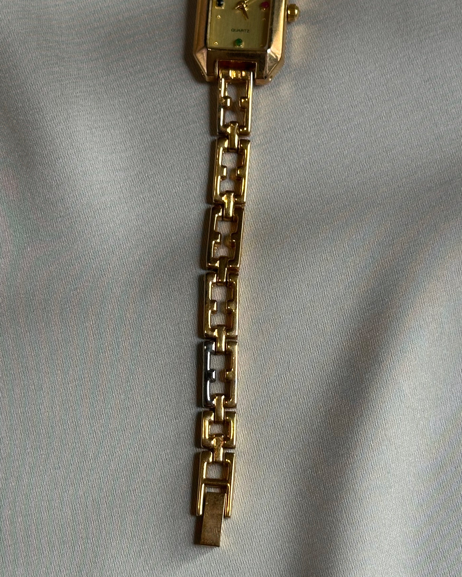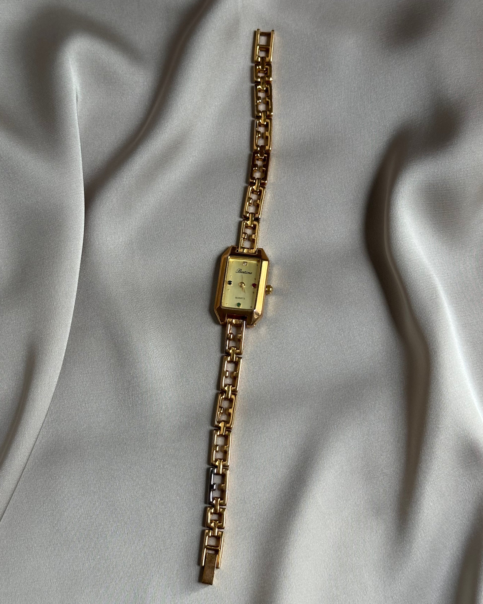 This vintage creation showcases a sleek rectangular dial framed in warm gold, its face accented by minimalist hour markers set with colored gem-like details in red, green, and dark blue. The clean design is paired with a geometric gold-tone bracelet, adding a refined architectural element that feels both modern and nostalgic.