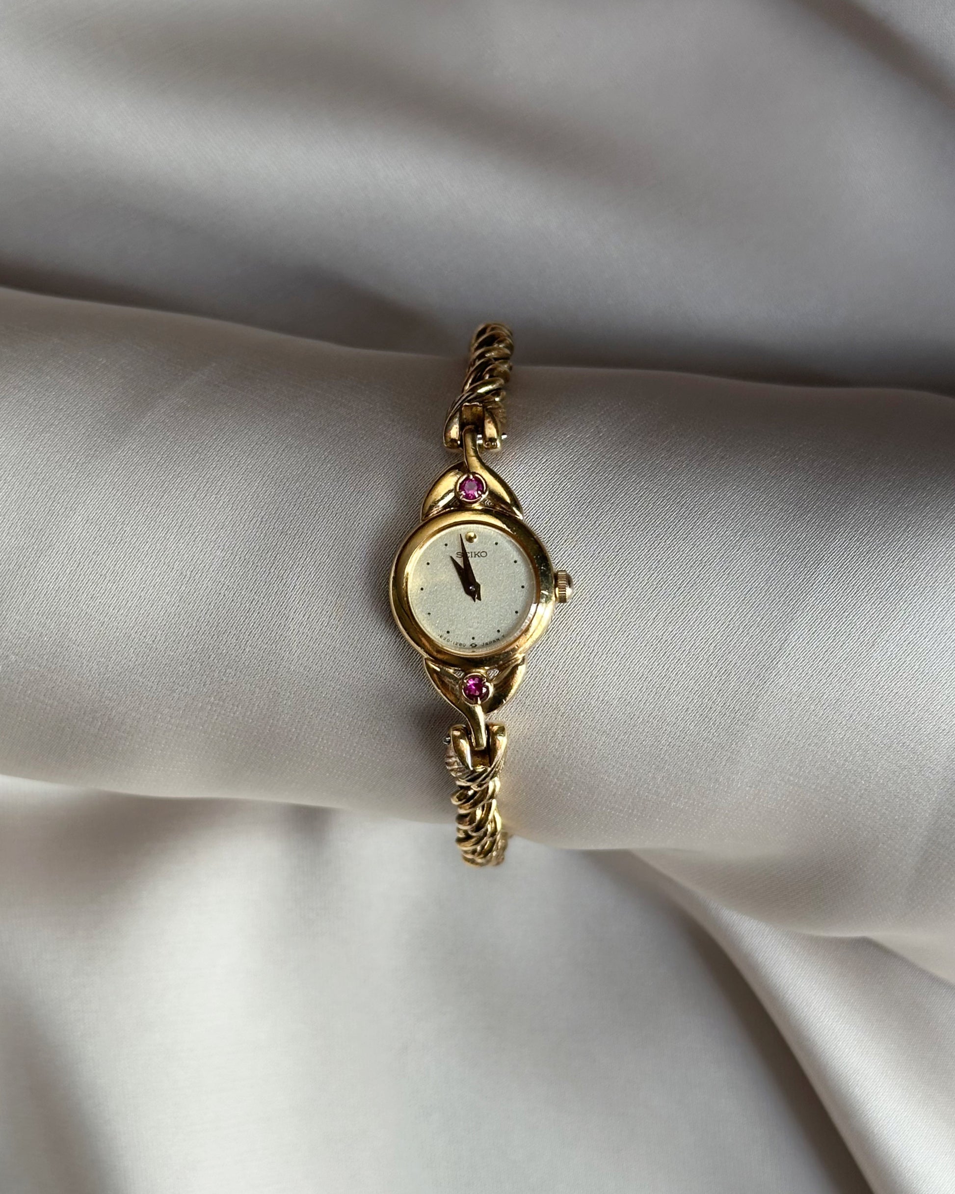 Delicate, sculptural, and a little bit whimsical — this vintage Seiko brings soft femininity into focus with its textured gold-tone rope bracelet and dainty round dial. But it’s the two pink crystal accents nestled into sculpted settings that give this piece its dreamy character — like blush-toned dewdrops resting on golden leaves.