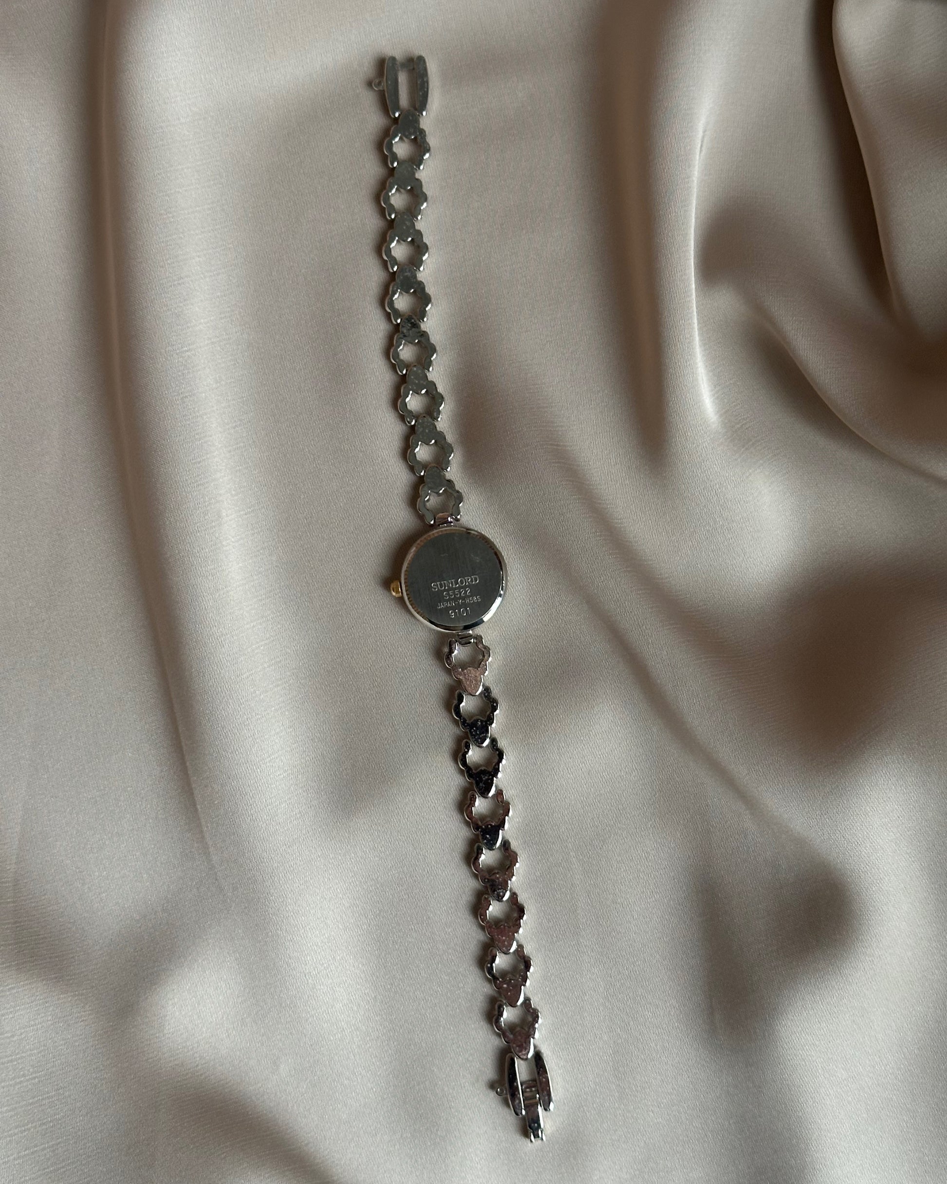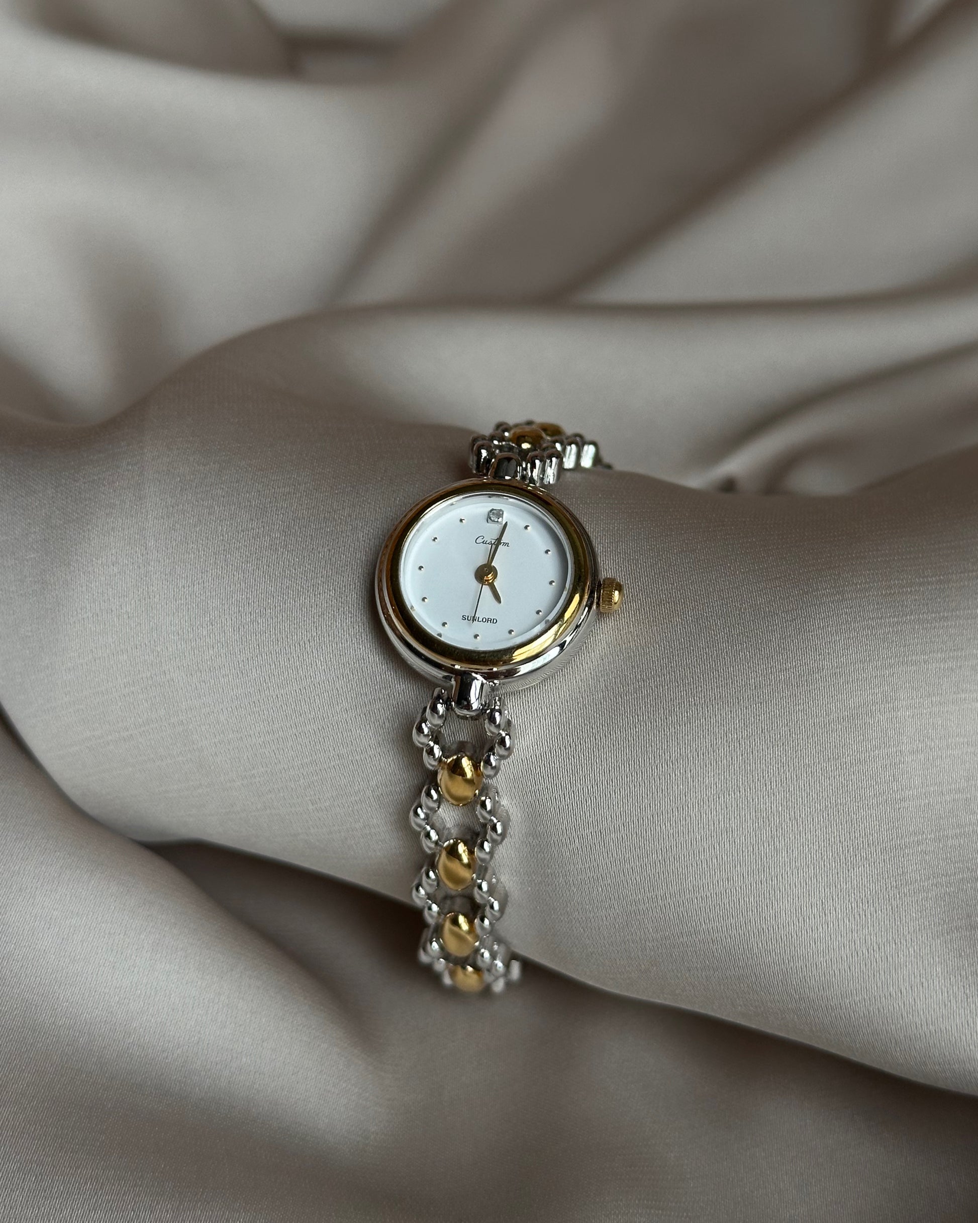 The bracelet is where the magic lies—each link formed by delicate beaded orbs, alternating in silver and gold, creating a soft, almost luminous texture that catches the light with every movement. It wears less like a watch and more like a vintage bracelet, perfect for layering with your favorite bangles or letting it shine on its own.