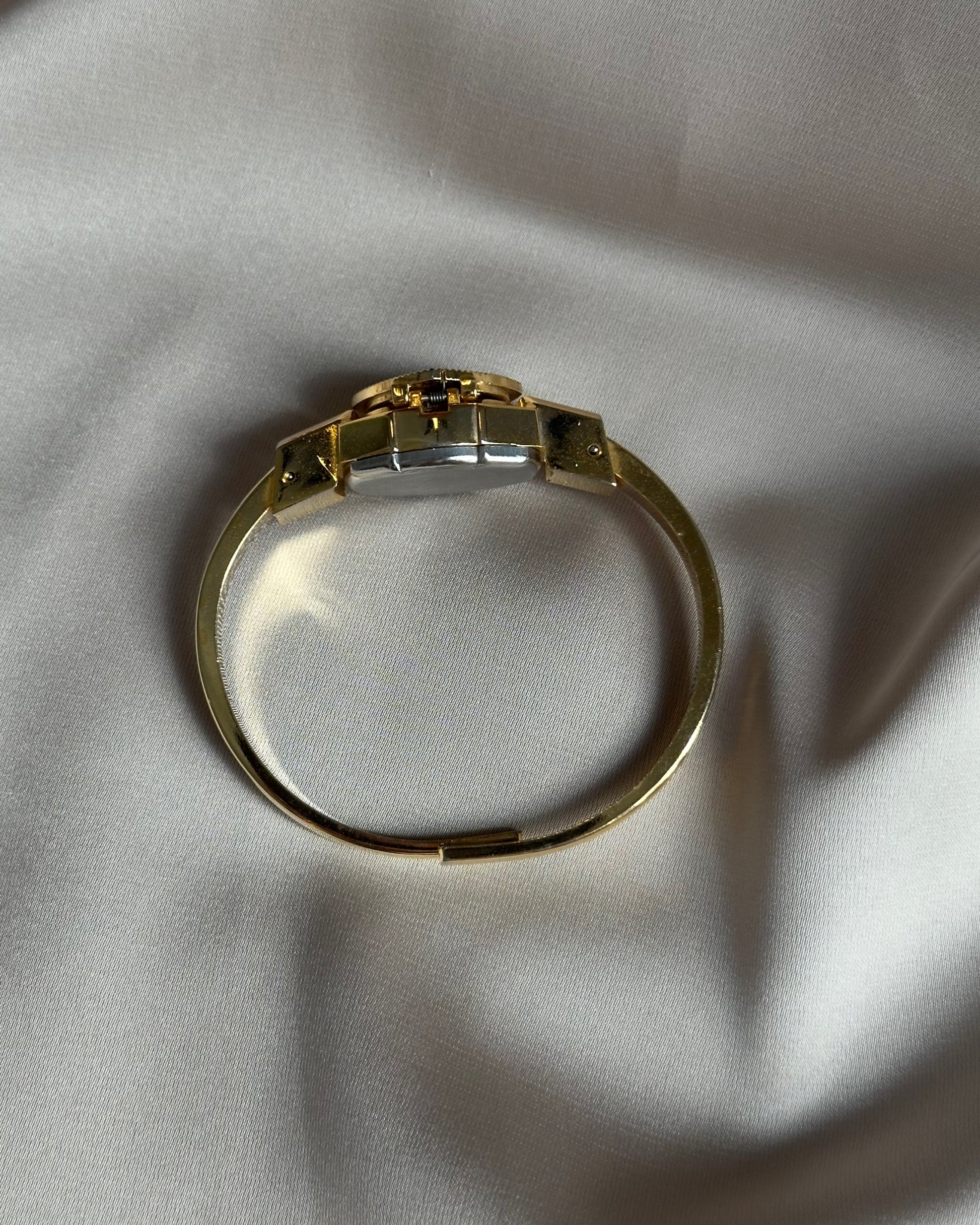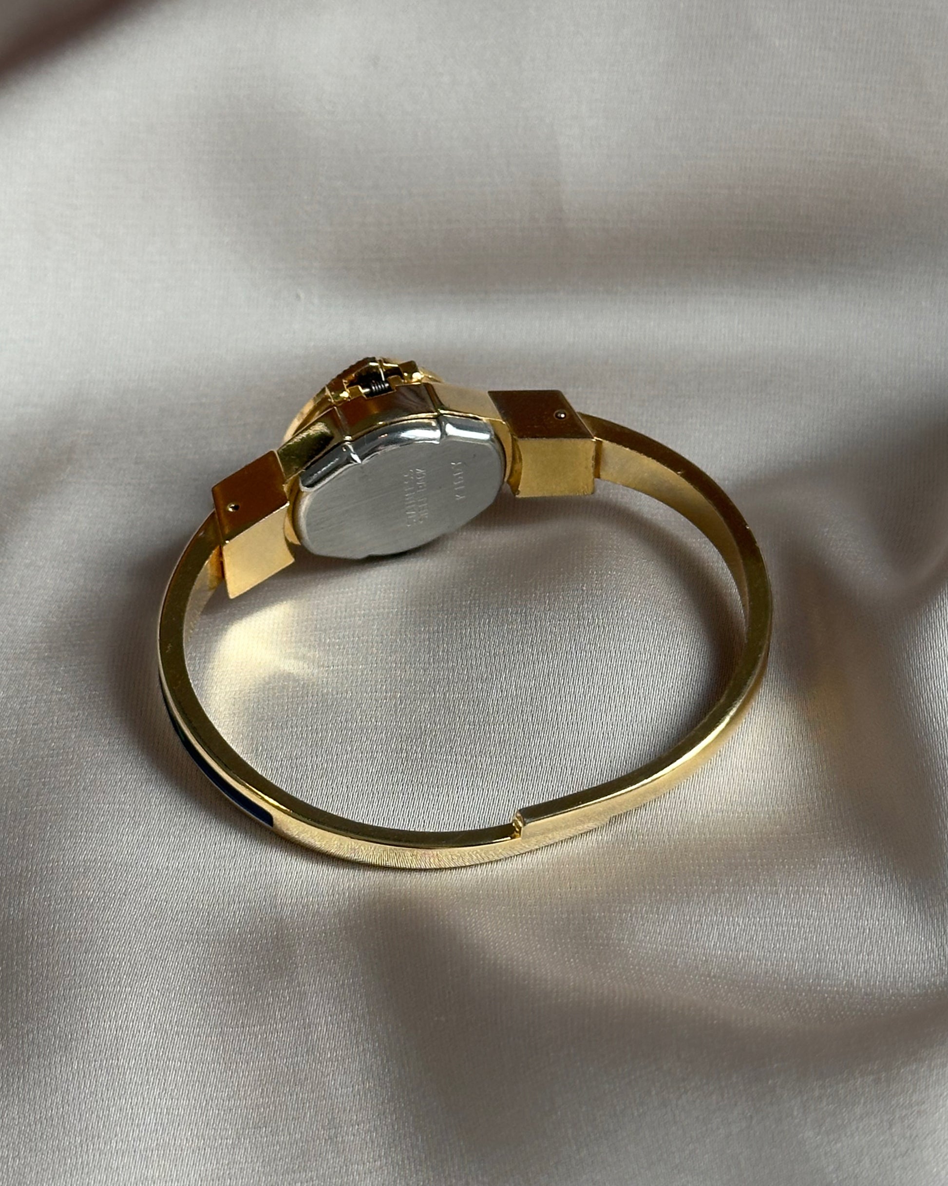 Its gold-tone bangle band is detailed with matching floral panels all around, making it feel more like a treasured bracelet than a timepiece. Gently lift the petal-like cover, and a classic ivory dial with Roman numerals peeks out—sweet, nostalgic, and full of story.