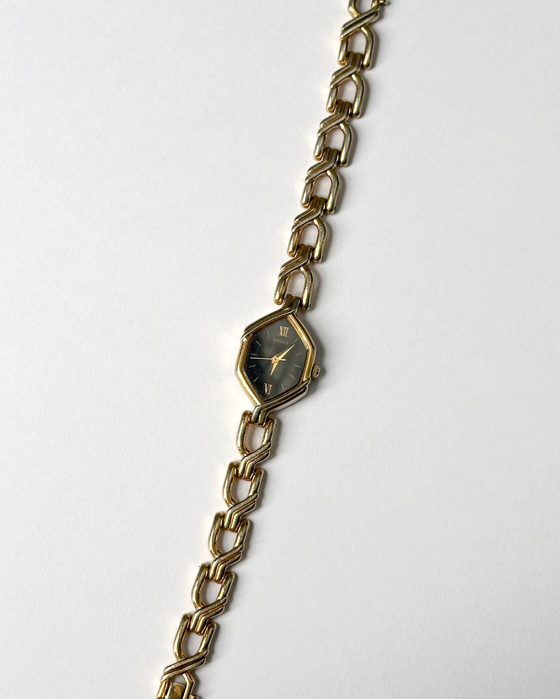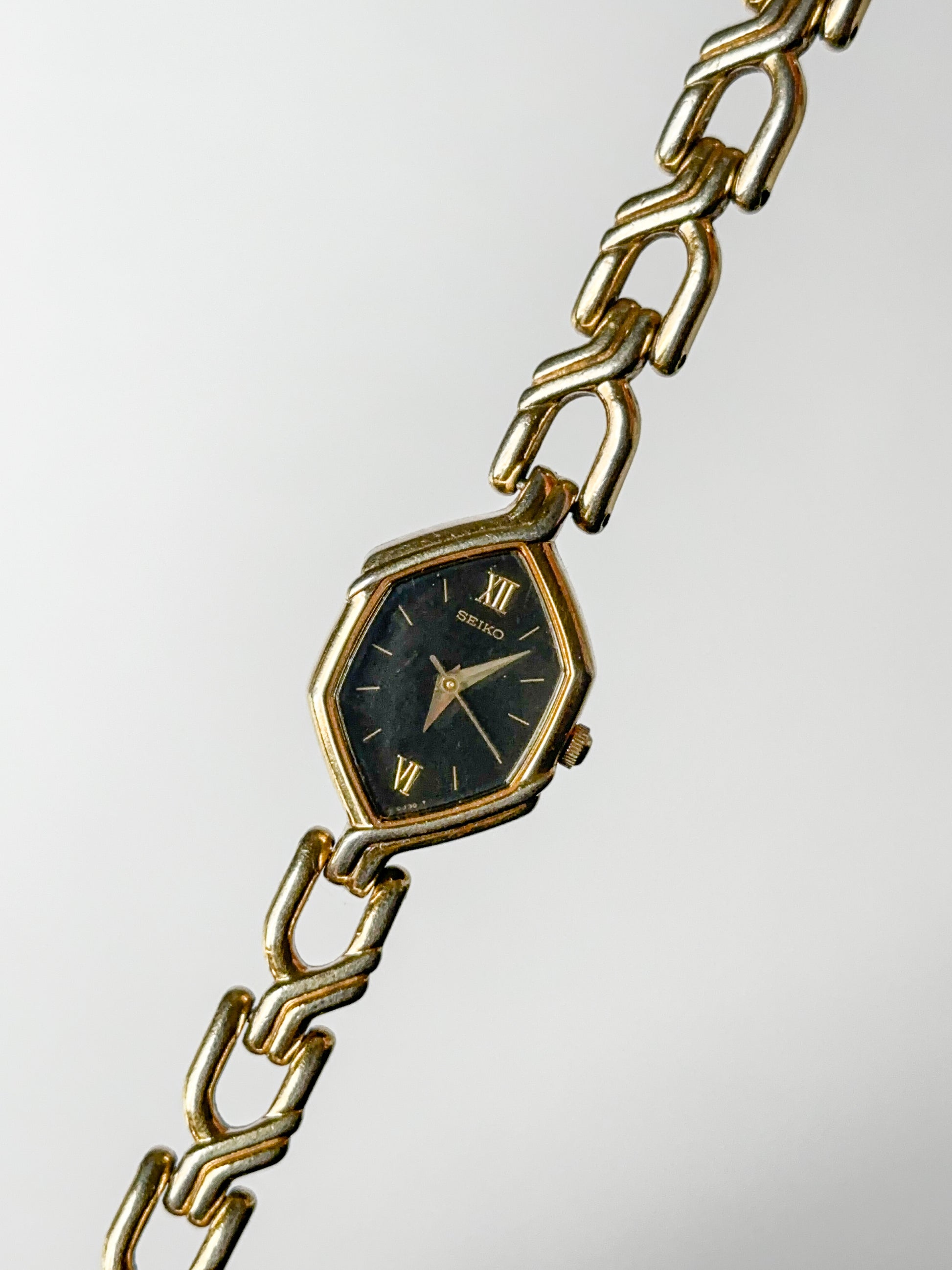 Vintage Seiko Hexagonal Black Dial Gold-Tone Bracelet Watch