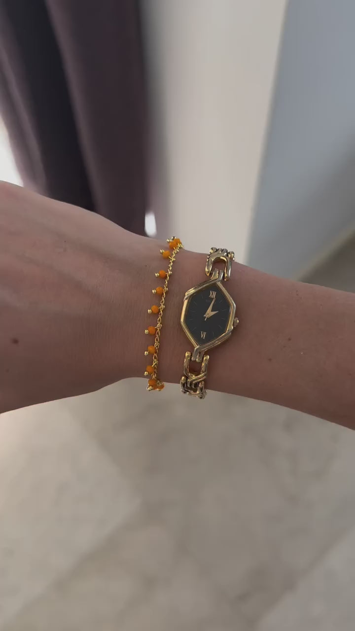 A timepiece that feels like a statement and a signature all in one. This vintage Seiko watch is a rare fusion of elegance and edge, featuring a striking hexagonal case that redefines classic sophistication. The deep black dial, adorned with Roman numerals, contrasts beautifully against the gold-tone case, exuding quiet confidence with every glance.